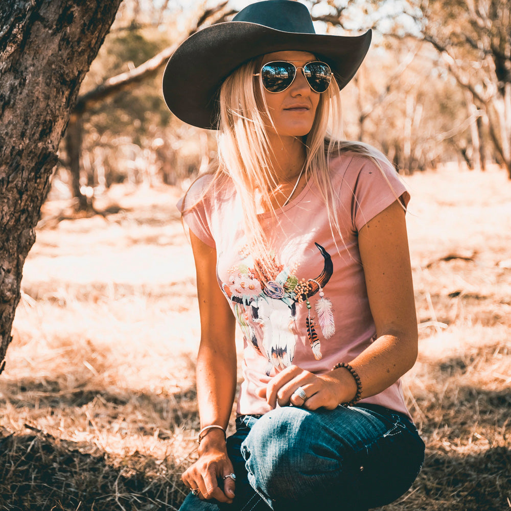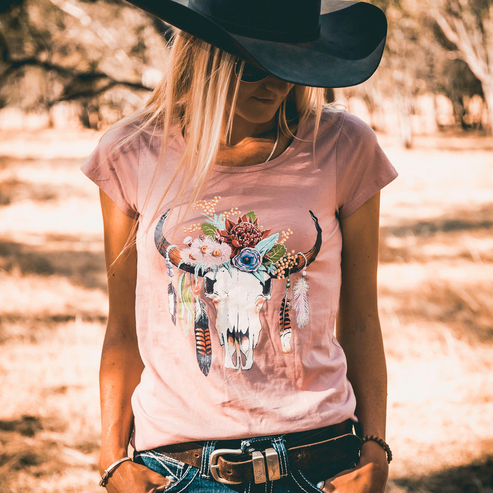 Australian Floral Cow Skull Ladies Scoop Pink Tee
